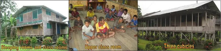 2. Guest house (2 x 45 m2). Two story building. Upstairs: one bedroom house, with 12 Volt DC lights and one 220 Volt AC light. Downstairs: Class room with ‘limbun’ floor which can accommodate 15-20 students.