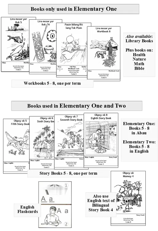The following Abau (with English) books are used in Elementary 1 and 2 or in the second year of a TPPS school.